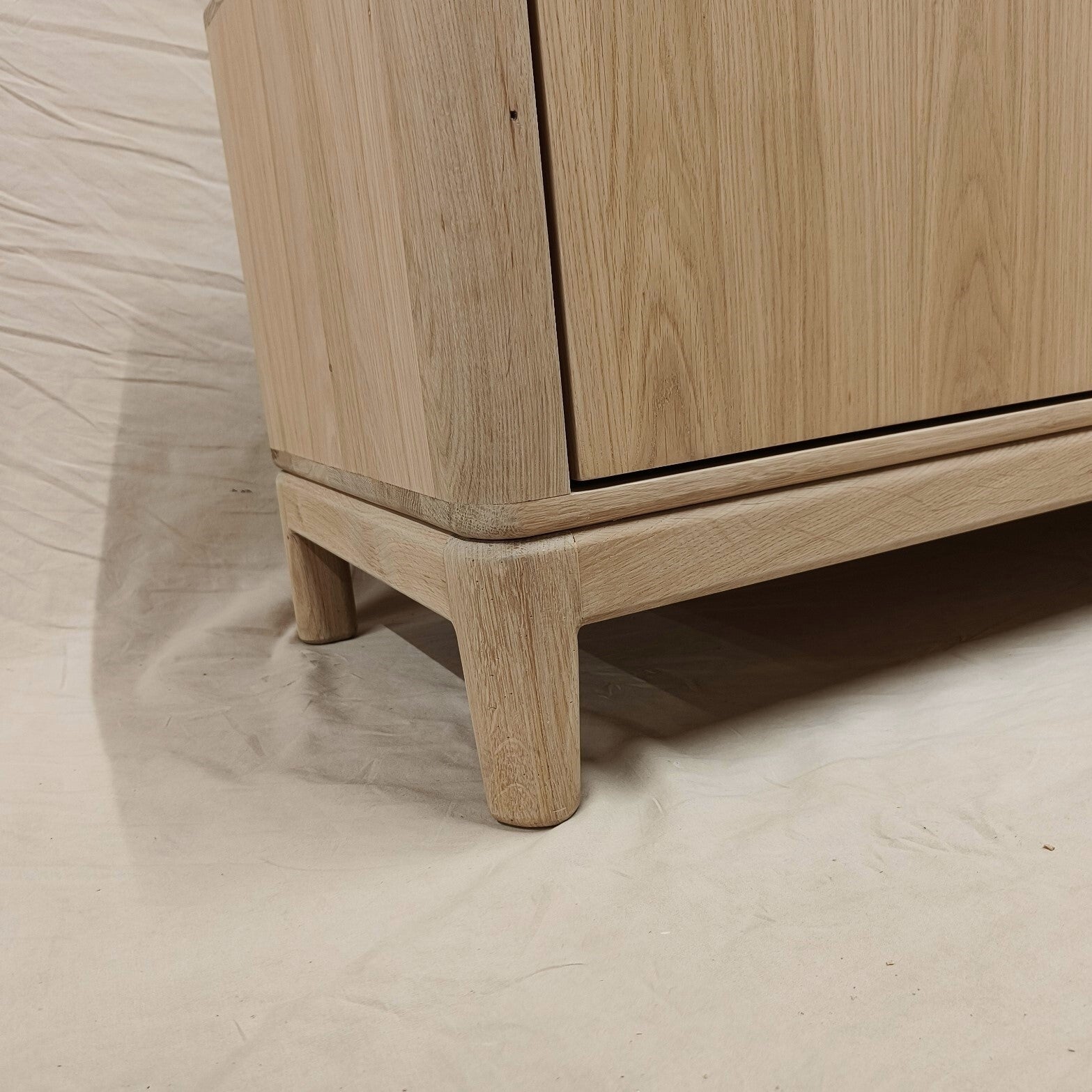 Het meubel staat op een houten onderstel met ronde poten, die aan de achterzijde verfijnd zijn verjongd. De afgeronde hoeken geven het een zachte, elegante look. Afgewerkt met zwart meubelbeslag, past dit TV-meubel perfect in elk interieur. Ook verkrijgbaar in diverse kleuren en volledig op maat gemaakt.