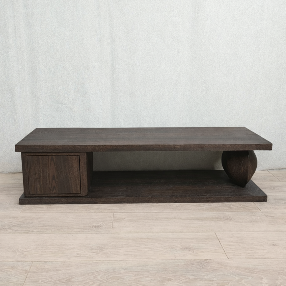Dit TV-meubel combineert functionaliteit met een sculpturaal design. Aan de rechterzijde zorgt de organisch gevormde bolle poot voor een stevige ondersteuning van zowel het blad als de bodem, terwijl de linker bol is vervangen door een praktische opbergkast. Hierdoor blijft het unieke karakter behouden met extra opbergruimte.